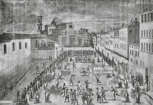 K velkolepému obrazu opilých davů, které se tísní na schodech Svatého ducha, vypjatých do výše jako trosečníci na voru Medúzy, před zavřenými dveřmi vznešeně strohé fasády, odtažité jako Zeď nářků, jež přestala naslouchat. V takovou chvíli my všichni ponejvíce připomínáme dezorientovaný dav barbarů, leč právě v tomto živelném a bezstarostném barbarství Florenťanů ve vlastním městě, kterému přestávají sami rozumět, spočívá paradoxně nejautentičtější a nejupřímnější obcování s tradicí, neboť my opilci jsme poslední instancí stravujícího přežívání renesančního dědictví bujarých slavností v dohledu kostelů.