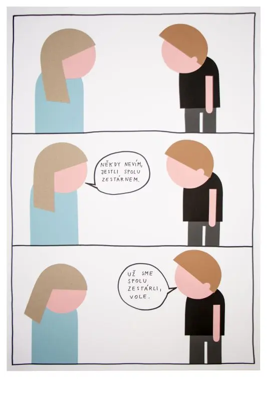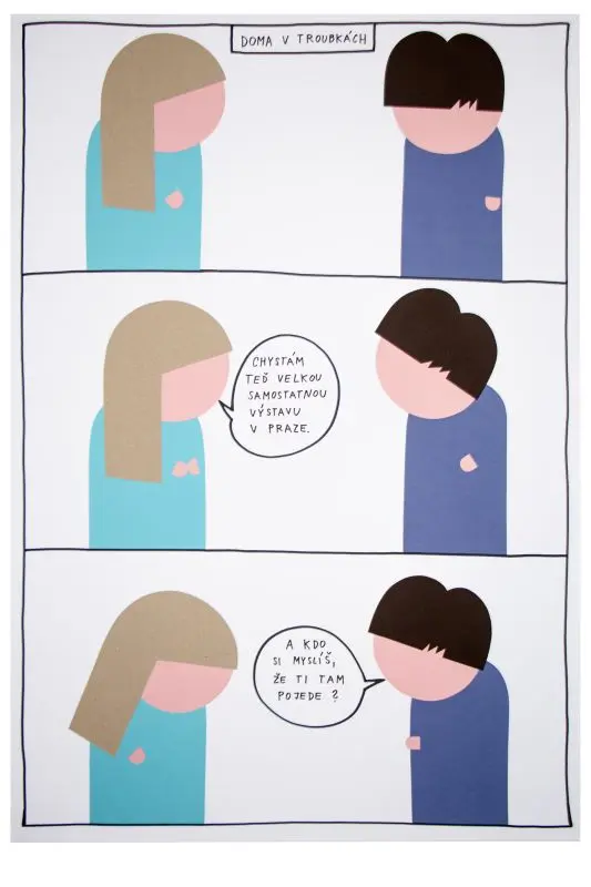 V Boskovicích budeme vystavovat vaše komiksy, což jsou krátké stripy většinou o třech polích. Je to jakási filozofie současné mladé ženy v kostce. Zdánlivě to jsou zábavné momenty, ovšem druhý a třetí pohled je často vážnější až mrazivější, divák si uvědomuje, jak je v něčem současná doba nelítostná. Máte obrovský cit pro psychologický detail a pro schopnost ve zkratce postihnout mezilidské vztahy. Jak se to tak stalo?