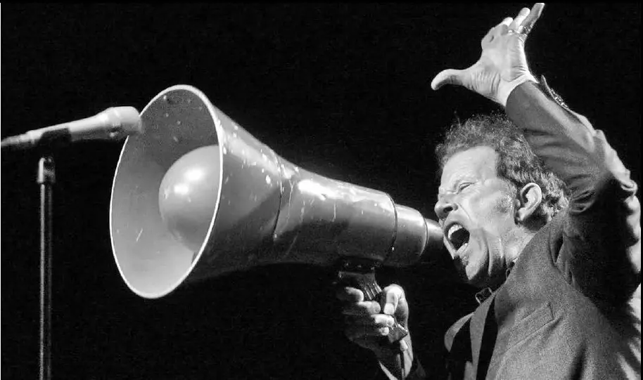 Představme si hlavu Toma Waitse jako včelín, v němž víří blizzard zadumaných ság, a zároveň odkudsi ze zateplené hospody synkopuje pianista doprovázející recitaci předchůdců hipsterů a beatniků, všech těch „jazz cats“ patřících k harlemské renesanci, od Langstona Hughese přes Jamese Weldona Johnsona až po Sterlinga A. Browna. Básníci typu Kennetha Rexrotha sklenou most mezi starými časy a nástupem beatu. Od Kerouakova románu Na cestě vede přímá štreka k nebezpečným chlápkům, jako je Burroughs hrající si na Viléma Tella. V Tomově hlavě není zas tak daleko od baladického, jazz-folkového debutu Closing Time s kytarou, klavírem a smutným saxofonem Rider. Tady už má Waits masku pouťového vyvolavače z očistce, přízračného orchestrionu, blouznivého kněze, vyluzujícího modlitbu Gospel Train na starou ledničku (aspoň to tak zní). V Tomově hlavě bydlí bluesový křikloun a násilník Howlin’ Wolf hned vedle dveří, ze kterých trčí mečounotrombóny. O úvodní písni alba Sworfishtrombones Waits dosti výstižně prohlásil, že zní jako banda zmutovaných trpaslíků hrajících ruský pochod. O kus dál v jeho palici – která, když jí zatřesete, připomíná rumbakoule z neúprosně stejnosměrných popěvků Bo Diddleyho – odkoukává Kurt Weill bluesovou dvanáctku od Keithe Richardse, „jediného kytaristy, schopného sólovat v pravém úhlu“. Ta deska, kterou spolu pečou, se jmenuje Rain Dogs a padají na ní trakaře – it’s raining cats and dogs – jako na neworleanském funusu, plném netrpělivých čumilů, kteří se nemůžou dočkat, až si na zpáteční cestě zatrsají v rytmu dixielandu.