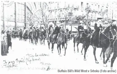 „Znamenitý kousek provedl plukovník Cody tím, že pro sebe a svoje lidi žádal o audienci u papeže. Papež nechtěl sice synům pouště povolit skutečnou audienci, ale svolil, aby ve výroční den jeho nastolení postavili se v loggiích v Sula Ducale, aby jej spatřili, až Buffalo Bill’s Wild West v Srbsku (Foto archiv) obklopen svou šlechtickou stráží a svatým kolegiem bude na purpurových nosítkách nesen do kaple sixtinské. Indiáni a ,cowboys‘ vyhověli tomuto pozvání a dostavili se ve svých pestrých krojích a s peřím ve vlasech, neboť také indiáni plukovníkovi jsou obráceni na víru křesťanskou. Když se svatý otec objevil svým rudým dětem, vyrazili ze sebe indiáni divoký skřek, jenž měl být výrazem oddanosti nebo úžasu, tak že papež skorem polekán, pozvedl obě ruce, jako by se jim chtěl bránit, pak se ale přívětivě usmál na pestrou tu společnost a pozvedl pravici, aby jim požehnal. Pak odešli representanti divokého Západu, toliko Buffalo Bill a Buck Taylor, ,král‘ cowboyů, vstoupili za papežem do kaple. Buffalo Bill byl ve fraku a bílé kravatě, avšak aby přece bylo vidět, kdo je, měl svůj obrovský šedý širák, jaký on a jeho ,cowboys‘ nosí při ,práci‘. Buck Taylor pak měl přes svůj kožený šat ještě kazajku podšitou kožešinou, aby vypadal poněkud civilisovaněji.“