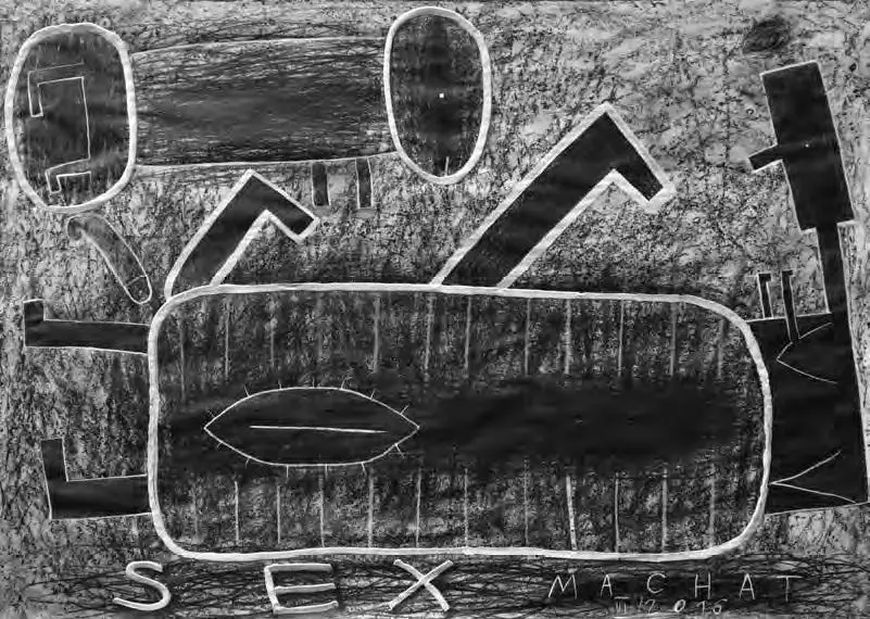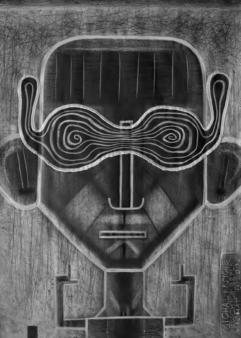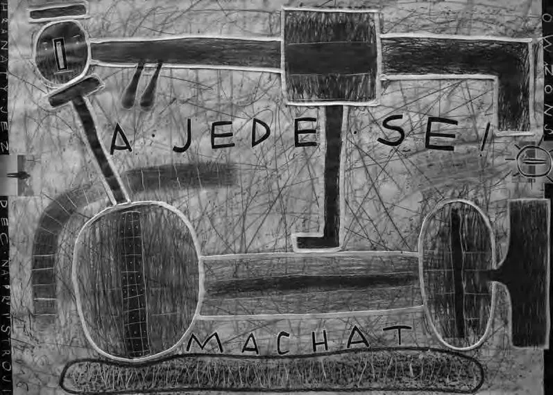 A jede se! – Snožmo – Hranatý jezdec na přístroji, 2016 (kresba tužkou, bílou tuší a akrylovým tmelem na papíře, 880 x 628 mm)