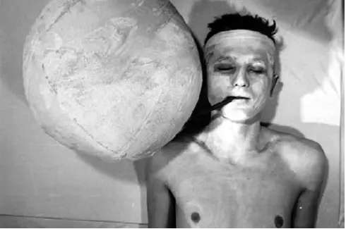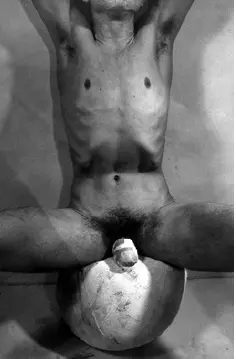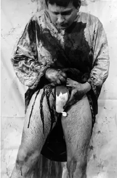 12_dox_2Nitsch současně patřil k prvním umělcům, kteří začali pracovat vel­mi radikálně s tělem. Ukazoval jeho zranitelnost a současně se zaměřo­val i na otázku velmi ožehavého té­matu kastrace a oslepení, což ukazu­jí už akce z šedesátých let, které ještě neoplývají záplavou rudé, spojované s akcionismem. První akce totiž byly černobílé. Rudolf Schwarzkogler, také tvůrce mnoha akcí na téma kas­trace, přidal modrou. Až později se prosadila rudá krev.