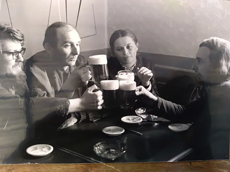 Scházeli jsme se v hospodě U Křižovníků v Křižovnické ulici na Starém Městě. Jenže tam otvírali později, od šesti, takže jsme museli častokrát za rohem nebo dvěma, kde byl hostinec U Svitáků, vyčkávat, až přijde naše hodina. Pak předělali křižovnickou pivnici na vinárnu. Což jsem kvitoval, protože tehdy, šlo o kraj sedmdesátých let, jsem už pil víno, a nikoli proto, že o mně Chalupecký prohlásil, že mám v hlavě jen „pivo a ředkvičky“. Navíc u Svitáků mě to nikdy příliš nebavilo. Takže jsem se snažil vždy odvést co nejvíc lidí ke Křižovníkům. Nejednou se stalo, že mi zastoupil cestu jistý nedostudovaný kunsthistorik, jmenoval se Pája Šťastný, s tím, že on je „trasman“, převaděč, ten, kdo vodí lidi z jednoho místa na druhé; vycházel ze správného předpokladu, že by tam někteří netrefili. Zatímco Křižovníci se scházeli nadšeně dál na svém místě, jen směnili pivo za víno, „ti připitomělí pivaři“, jak říkal správně Otakar Slavík, chodili pořád za ten roh nebo dva ke Svitákům.