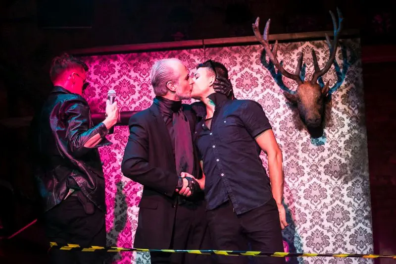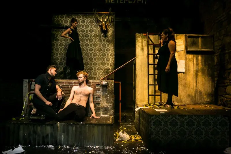 V úvodu i ve finále evokují postavy v černém a v kloboucích naražených „ještě více do čela“ podezřelou anonymitu velkoměsta, na důmyslně řešené scéně (Mariana Kuchařová), tvořené z několika nestejně vysokých plošin i spojovacích žebříků, se ocitneme v bordelu se „sado-maso“ stylizací i v parní lázni. Z herců prýští mladistvá energie, vyniká především Tomáš Havlínek jako nemocný spisovatel Váňa (o nové posile Městských divadel pražských jsem už pochvalně referoval v recenzi Andělů v Americe, UNI 3/2019). Jeho zjitřená kreace, náročná též pohybově (v tomto ohledu ovšem režisér „nešetřil“ ani ostatní aktéry), by mohla vést k interpretaci, že se všechno odehrálo jen v chorobných představách nadějného prozaika. Nataše Mikulové napomáhá k dokreslení dojemné bezbrannosti a emocionální nepraktičnosti kromě hereckého talentu i její plnoštíhlý habitus. Václav Švarc pak prezentuje rozháraného Aljošu v neuroticky přesvědčivých zvratech nálad.