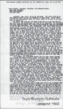 veřejně vydanou nahrávku Woody Guthrie – The Library of Congress – Three Hours of Songs and Conversation as Recorded by Alan Lomax (Elektra, 3-LP, 271/272). A byl to právě Alan Lomax, kdo osobnostně a názorově kontroverznímu, leč umělecky velmi působivému Guthriemu (jeho píseň This Land Is Your Land se dodnes zpívá ráno ve školách jako jakási druhá americká hymna), který později až nepochopitelně obdivně propagoval ideologii sovětských stalinistů, pomohl k získání dodnes platného statutu národního folkového barda z „prašných tornád plání Oklahomy“, když ho již tehdy prominentně uváděl ve své rozhlasové show Back Where I Come From v rozhlasové síti CBS. O mnoho let později sám Alan Lomax vzpomínal, že mezi jeho vůbec nejlepší období v životě patřila léta, kdy se přátelil právě s Leadbellym a Guthriem.