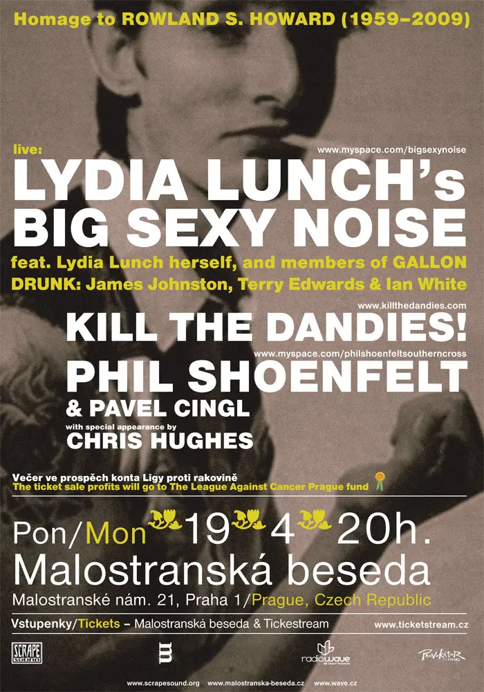 Homage to Rowland S. Howard se uskuteční 19. dubna v nedávno obnovené pražské Malostranské besedě bohužel, ne za účasti alternativní královny Lydie Lunch s jejími Big Sexy Noise, protože letadla stále nelétají a francouzské vlaky nejezdí.
