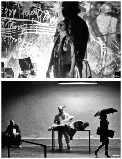 Tři po sobě následující projekty ve Veletržním paláci (během jednoho odpoledne a podvečera) připravily zážitky poněkud disparátní. V alternativních kruzích renomovaná brněnská skupina D’EPOG prezentovala titul Ležatá osmička (visí snad téma „nekonečna“ letos nějak víc ve vzduchu?). V dramaturgii Matyáše Dlaba a režii Lucie Repašské bylo publikum ve dvoraně paláce snad s nejvyšším možným stropem a z něho vyplývajícím „kosmickým“ echem podrobeno rodinnému hororu, který ztvárnili tři pohybově suverénní protagonisté (Radim Brychta, Zdeněk Polák a Janet Prokešová), mikroklima základní sociální buňky však bylo – alespoň pro mě – zpodobeno poněkud nečitelně. Ne že bych nerozuměl podstatě dílka, rodiče dítě vychovají, posléze tyranizují, podobně i celá společnost, potomek to později vrací „i s úroky“. Genderové rozostření (maminku představoval muž s mohutně adjustovaným poprsím, tatínka žena – mladší kolegyně v recenzi pro web DN tyto postavy přečetla jako otcomatku a sestru) je prostoupeno kvalitními vokály při notování vánočních koled i lidových písní. Jevištní metafory se cyklicky opakují: cvičení na „hrazdě“ mezi skříněmi, kterou může suplovat berle či lidská ruka, výživový efekt, charakterizovaný přidáváním kečupu na jinak prázdný talíř. Rodinka je od publika dosti vzdálena (prý tak skupina hraje inscenaci všude), díváme se na to pinožení z odstupu a já zůstávám zcela nezasažen, ba navíc se dostavuje – bohužel – i nuda. Kdoví, třeba je to všechno o něčem úplně jiném, v anotaci k představení se mimo jiné píše: Obrazy extrémního rodičovství. Na ležaté osmičce rodič plodí dítě a dítě plodí rodiče.
