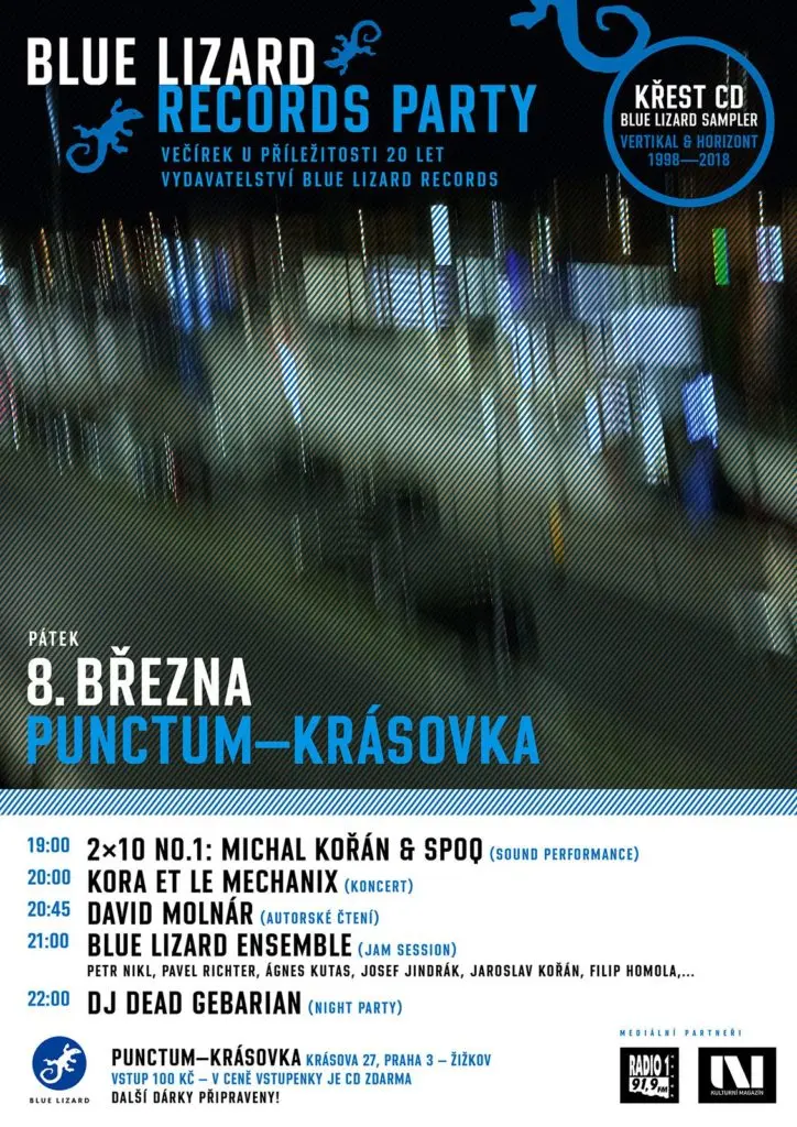 Výroční oslava Blue Lizard Party Night se uskuteční v pátek 8. března 2019 v klubu Punctum–Krásovka na pražském Žižkově. Během večera zahrají Kora et le Mechanix a speciální hudební těleso Blue Lizard Ensemble, složené z hudebníků, kteří na tomto labelu realizovali své nahrávky. Těšit se můžete na Petra Nikla, Pavla Richtra, Filipa Homolu, Jaroslava Kořána, Ágnes Kutas, Josefa Jindráka a řadu dalších.