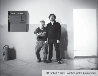 Zakladatel a klávesista kapely Faust Hans Joachim Irmler je průkopníkem krautrocku, F. M. Einheit je známý zejména jako zakládající člen a dlouholetý perkusista německé industriální kapely Einstürzende Neubauten. Obě jména jsou těžkými kalibry, které teď násobí svou sílu ve společném hraní na mnoha pódiích po celé Evropě. Bude to vzpomínání na staré dobré časy, nebo pánové mají říci leccos i dorůstající generaci posluchačů, kteří v době, kdy Hans byl na vrcholu popularity, ještě nebyli na světě?