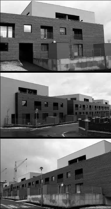 Absence jakéhokoliv akceptovatelného kontextu proto nekladla tvůrčí invenci žádné meze a svažitá terénní konfigurace přímo volala po tvarovém experimentu. Autoři se však vydali na osvědčenou cestu jednoduchosti, až utilitární funkčnosti, vlastní jejich tvorbě. Ne proto, že by odmítali experimentovat s nekrabicovými objemy, či snad strohou vizáž automaticky odvozovali od výše finančních nákladů. Podobu pětice jihlavských bytovek předurčil ostrý kontrast řádu a chaosu, tedy panelového sídliště a nové rozestavěné obytné čtvrti. Bytovky tak představují jakési, soudobé paneláky‘. Nehledejme ovšem v tomto přirovnání nic pejorativního, spíše opak. Architekti si od sousedních panelových domů vypůjčili některé z jejich původních kvalit (urbanistické schéma, dostatečný prostor či geometrický rastr a řád), přijali je za své a s dílčími úpravami a novými prvky je aplikovali na lidskému měřítku přizpůsobené obytné domy. Práce s kartuziánsky geometrickým rastrem je sice patrná na každém z pětice domů, ovšem k tvarově nejčistšímu řešení autoři dospěli v drobných hranolech dřevem obložených rodinných domků, připojených po stranách ke skupině D a E a komunikačně spojujících trojici růžových objektů ABC. Vznikly zde společné prostory s miniaturními, bonsajistickými‘ předzahrádkami a dětskými hřišti, jež strohým budovám propůjčují charakter důvěrně známého prostoru, intimitu a především pocit domova.