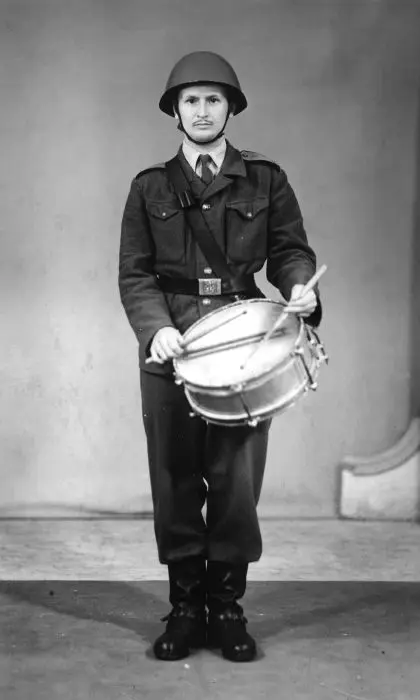 Vyfasoval jsem bubínek a paličky, šel jsem ke kavalci a začal jsem se učit házet paličky v rytmu do výšky. Žádné šmé, jak se točí kolem prstů. Při pochodu jsem je vyhazoval, točily se ve vzduchu, lítaly dost vysoko. Pak jsem začal i aranžovat a dával jsem dohromady kapelu: trumpeta, trombón a dva saxofony a rytmika, hrál jsem celé bicí. Pro ni jsem napsal vůbec první aranžmá ve svém životě, nebylo to ani tak špatné – transponovat jsem se už po své zkušenosti z gymnázia naučil (smích).