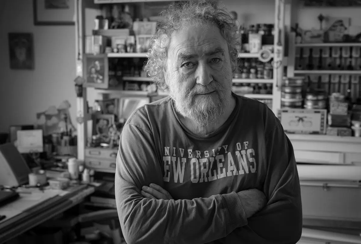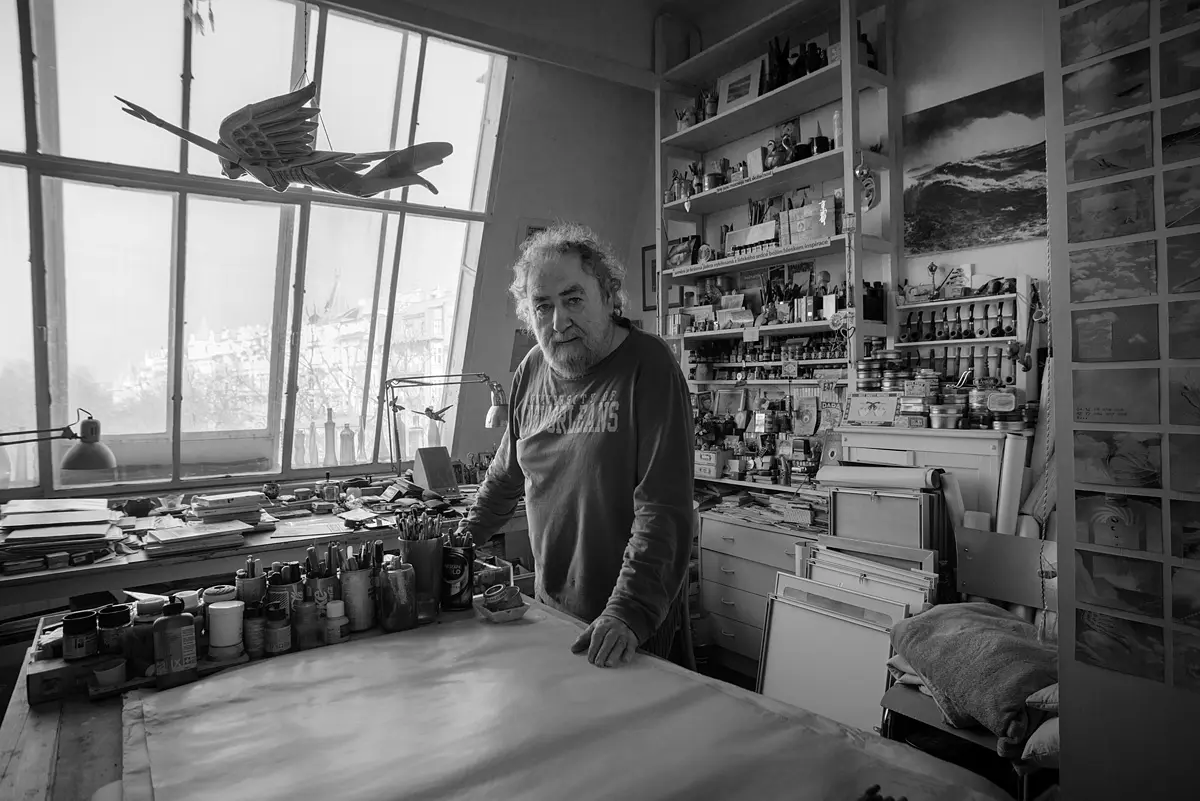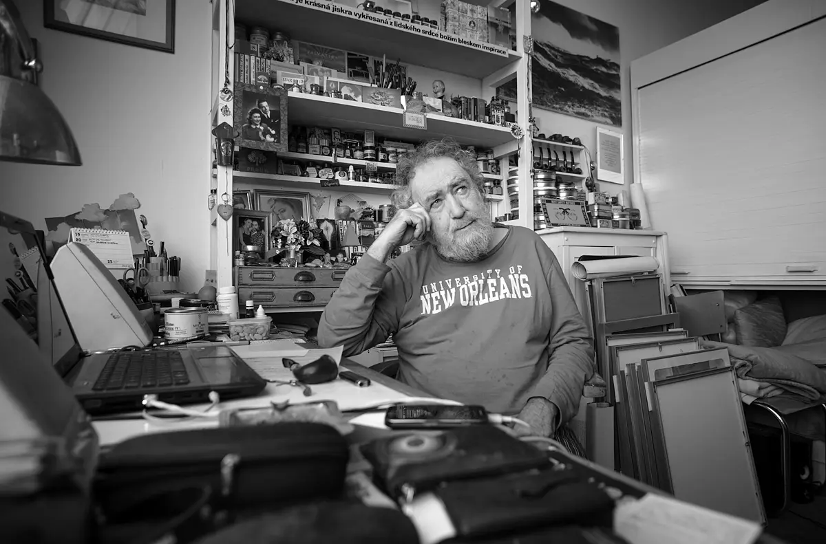 Dělal jsem malíře písma a dekorací v Divadelním studiu, takže jsem maloval kulisy, třeba Cimrmanům a různě. Bavilo mě to, malování velikou štětkou, ale pak jsem toho musel nechat, protože jsem měl zdravotní problémy a rok byl v invalidním důchodu. Chodil jsem o berlích, navíc v šedesátém devátém jsem přišel o zrak pravého oka. Sice mi ho nechali, ale musel jsem přerušit školu a učit se, jak daleko jsem od papíru, nebo jak daleko jsem štětcem od plátna. Pomalu a pomalu… Trvalo mi to rok. Do toho mi tragicky zemřel bratr, takže toho bylo hodně… Celou tu etapu, co bude vystavena v Doxu, jsem dělal jedním okem. Neříkám, že to je zase tak obrovský handicap – když si třeba řeknu, kolik dioptrií měl Josef Lada a jaké věci dokázal udělat…