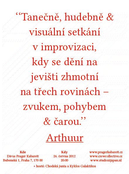 Projekt ARTHUUR je propojení tanečního a hudebního setkání v improvizaci, při které je dění na jevišti graficky zaznamenáno. Tento projekt vznikl v česko-holandské spolupráci mezi tanečníky, grafickými designéry a hudebníky jako výzkum způsobu, jak různě se může projevit jedna událost, které se společně s divákem účastníme. ARTHUUR se sám vlastní silou rozvíjí spíše jako site – specific projekt, rád reaguje na různá prostředí a způsob prostorového ohraničení. V minulém roce byl tento projekt v České Republice uveden třikrát – v kapli sv. Ducha v Liběchově, v kostele Sv. Kateřiny v Chomutově během festivalu Obnaženi a v zámecké salle terreně v rámci tanečního festivalu SIRAEX v Klášterci nad Ohří. Tentokrát mají diváci jedinečnou příležitost vidět projekt ARTHUUR poprvé v Praze v prostředí galerie.