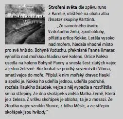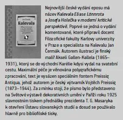 Finský národní epos Kalevala se letos dočkal nového vydání v nakladatelství Academia. Úctyhodná publikace o 1100 stranách u nás poprvé vychází s původními finskými ilustracemi, text doplňují detailní a zasvěcené poznámky i řada studií, které Kalevalu zasazují do širšího kontextu. Pro laické čtenáře je možná překvapením, že nakladatel použil 120 let starý český překlad Kalevaly od Josefa Holečka (1853–1929). Důvodem není žádné staromilství, ale fakt, že Holečkův překlad je stále nejlepší a dodnes živý, i když „některá slůvka už nejsou běžně srozumitelná“, jak v úvodu jemně upřesňuje spisovatelka Markéta Hejkalová, která lichotivou nabídku vytvořit nový překlad s grácií odmítla. Ta lehce archaická slůvka, o nichž se zmiňuje, jakoby textu dodávala autentickou patinu, tedy kvalitu, která ke starý eposům zkrátka patří. Kalevala přitom ale nepředstavuje žádné suchopárné čtení: nalistujte kteroukoli stránku a rytmus jazyka i spád děje vás okamžitě vtáhne. Slova ubíhají v čase jak údery perkusí, Kalevalu proto nelze doporučit jako uklidňující četbu před spaním.