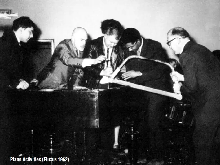 Vráťme sa však do Veľtrhového paláca NG, o dve poschodia nižšie. Provokujú tam inštalácia a video Wolfa Vostella – štylizované dokumenty jeho akcie z roku 1982, nazvanej lakonicky Performance. Prezrádzajú, že Vostell počas nej dlátami zbavil klavír poltónov (čiernych klávesov) a vylepšenú klávesnicu polial mliekom a zabetónoval. Šokujúce gesto neúcty treba vnímať v historickom kontexte o dvadsať rokov staršej akcie na 1. medzinárodnom festivale Fluxu (organizátori ho nazvali ‚festivalom Najnovšej hudby‘), na ktorej Vostell participoval. Bolo to v septembri 1962 v nemeckom Wiesbadene a festival vošiel do dejín práve vďaka nej. Bol ňou škandalózny kus Piano Activities od amerického hudobníka Philipa Cornera v realizácii Georga Maciunasa, Dicka Higginsa, Benjamina Pattersona, Emmetta Williamsa, Nam June Paika a Vostella. Uvedeným pánom sa vtedy interpretácia ‚trochu‘ vymkla spod kontroly (avšak nie z rúk) a na pódiu primitívnymi nástrojmi (sekerou, kladivom a pílou) rozobrali koncertný klavír, na ktorom predtým odzneli skladby od Johna Cagea, Philipa Cornera, Terryho Rileya, La Monte Younga, Alvina Luciera, Frederica Rzewskeho, Yuji Takahashiho, Dietera Schnebela, Dicka Higginsa, Sylvana Bussottiho a ďalších avantgardných hudobníkov a performerov. Časti klavíra následne vydražili.