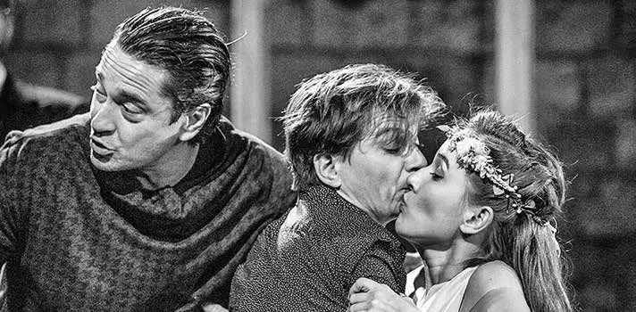 S „open air“ podmínkami tvůrci letních shakespearovských inscenací ovšem počítají, týká se to i té letošní. Režijní tandem SKUTR (Martin Kukučka a Lukáš Trpišovský, oba 1979) nepatří rozhodně k divadelním tradicionalistům. Múzičtí a k jisté artistnosti inklinující umělci (říkejme jim, jak je všeobecným zvykem, Skutři) se dovedou oprostit od zbytečného verbálního balastu, ale i od části textu třeba geniálního, jaký představují jiskřivé Shakespearovy monology a dialogy. Aranžmá výtvarné a pohybové, podpořené často invenční a originální zvukovou stopou, činí z jejich jevištních děl atraktivní tvary. Od víceméně alternativně- autorských projektů se postupně dostali ke klasickým formám, mezi jejich operními režiemi mě potěšily Janáčkovy Výlety pana Broučka v ostravském Národním divadle moravskoslezském. Za pozoruhodné činoherní počiny pak považuji ty, které Skutři realizovali v Klicperově divadle v Hradci Králové: šlo o originální zpracování tématu z Čajkovského baletu Labutí jezero a jevištní verzi Puškinova románu ve verších Evžen Oněgin. Dva hradecké herce, Jana Sklenáře (v Klicperově divadle „labutího“ prince) a Miroslava Zavičára (Oněgina tamtéž) Skutři angažovali i v dynamické „hradní“ inscenaci, vycházející z překladu Martina Hilského.