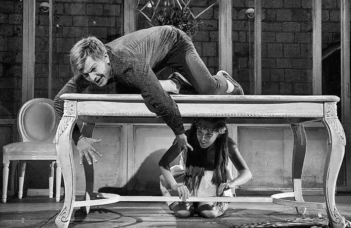 Hradecký Miroslav Zavičár zpodobňuje jakéhosi průvodce a komentátora: mění se, aniž by musel převlékat svůj společenský oděv, v chór, knížete, lékárníka či posla, je zároveň pomocníkem a asistentem při mnoha konkrétních úkolech, třeba manipulaci s nábytkem, figuru prezentuje v lehce ironické poloze. Paris s Tybaltem jsou už z úradku režisérů postavy v podstatě okrajové. Inscenace je načechrána několika pěknými tanečními čísly (s kordy, ale také s motýlími křídly, kterých po Juliině entrée později přibude i na tančícím komparsu), vydařený – také v pohybové stylizaci – je onen zlom nálady, při němž ztrácejí svůj život Merkucio a Tybalt. Nemám nic proti pobytu mrtvých figur na jevišti, ale tentokrát mi popíjení kávy a zobání pochutin oběma zmiňovanými připadlo rušivé, odvádělo pozornost od důležitějších jevištních situací a navíc přinutilo zamyslet se nad problematičností některých kostýmů (Linda Boráros). Merkucio měl na holém trupu nepadnoucí červenou vestu bez rukávů, nepřípadně se mu na těle krabatila. A Tybalt (Jakub Gottwald) v černé kazajce a kraťasech moc zlověstně nepůsobil. Výhrady mám i k výjevu, kdy rozdurděná Julie začne lehce dotírajícího Parise (Michal Sieczkowski), s kterým se potká po jeho audienci u bratra Vavřince, mlátit pugétem, který on nosí jako snoubenecký znak stále při sobě. I finále (dvě sebevraždy v hrobce) mi připadlo poněkud urychlené a výrazově rozmlžené, po něm ovšem mrtví milenci-manželé dostanou od komparsistů křídla a odbíhají (odlétají). Vzhůru k nebesům?