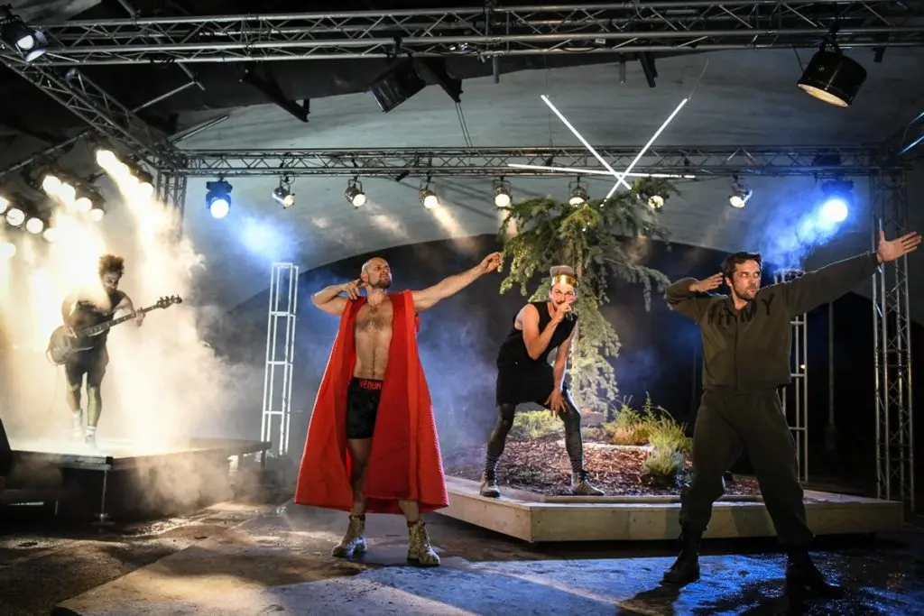 Pod obloukem Hlávkova mostu je zbudováno hlediště a před ním jakási zahrádka se stromem a studánkou, která nezabírá příliš mnoho místa a je ohraničena. Scénografii spoluvytvářejí tyčovité zářivky, vymezující hrací prostor (ten bývá ovšem ve vypjatých situacích prolomen), několik se jich spojuje do hvězdicovitého svítidla, luminiscenci ovšem ve větší míře realizuje sada reflektorů, celý technický „park“ zahrnuje i zesilovače, mikrofony, reproduktory a mixážní pult, kolem něhož za rachotu téměř rockových decibelů řádí dvoučlenný chór (rapující a občas i libě zpívající Dan Kranich plus s baskytarou se svíjející Ivo Sedláček). Rtuťovití performeři nás uvedou do děje a pak některé jeho zvraty komentují. Bylo by asi pošetilé kritizovat občas zhoršenou srozumitelnost jejich průvodcovské mise (možná to zvukař při reprízách nějak „vychytal“), zvlášť když dikce ostatních herců je nadstandardně příkladná.
