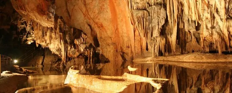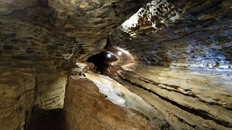 Sto milionů let staré jeskynní prostory, ležící „asi jednu nebo dvě míle od Hannibalu po proudu řeky (…) mezi skalními útesy“, měří na délku deset a půl kilometru, mají 260 průchodů a dá se do nich vejít čtyřmi různými vstupy. V dávné minulosti je využívali indiáni, znovuobjeveny byly v zimě roku 1819, kdy se k nim zatoulal mladý bílý lovec Jack Simms. Ve sněhu objevil stopy pantera, bylo však už příliš pozdě, aby se po nich vydal, a tak se na místo vrátil druhý den s bratry Williamem a Roderickem a s přítelem J. H. Buchananem. Lovili pumu s puškami a honicími psy, až došli k otvoru na svahu kopce. Psi vběhli dovnitř a jejich štěkot se vzdaloval. Muži tedy zapálili louče a vydali se po zvuku. K jejich překvapení se ocitli v rozhlehlých prostorách, kde bylo mnohem příjemněji než venku v mrazivém počasí, které toho dne panovalo.