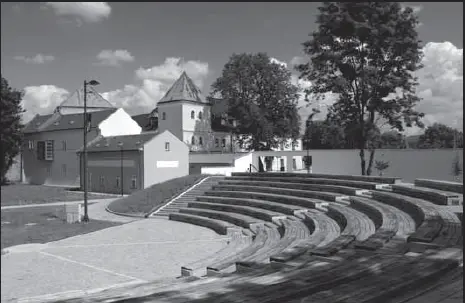 nepodléhá času a už vůbec ne módním trendům, neboť architekt pracuje s osvědčenými postupy i tradičními materiály. A to jsou hodnoty, kterých bychom si obzvlášť dnes měli cenit, a jsem rád, že si jich ve Velké Bystřici považují. A není divu, vždyť proměna tamního Zámeckého náměstí je vskutku v nejlepším smyslu slova šokující. Každý, kdo tento neutěšený, chao sem a značnou dávkou normalizačního zmaru ovládaný prostor znal, se po právu mohl ptát, dá se s ním vůbec ještě něco udělat? A přitom stačilo málo. Náměstí vrátit řád, rekonstruovat přilehlé budovy a park jednoduše protknout sítí pískem sypaných cest s několika půvabnými dřevěnými mostky. K pevnému vymezení náměstí, do jehož středu architekt situoval fontánu se čtveřicí stromů, mu posloužily prosté omítané zdi, zčásti opatřené stylizovanou betonovou arkaturou připravenou na atak popínavé či pnoucí se zeleně. Nově vztyčená zeď s dvojicí průchodů přitom jen neohraničuje prostor Zámeckého