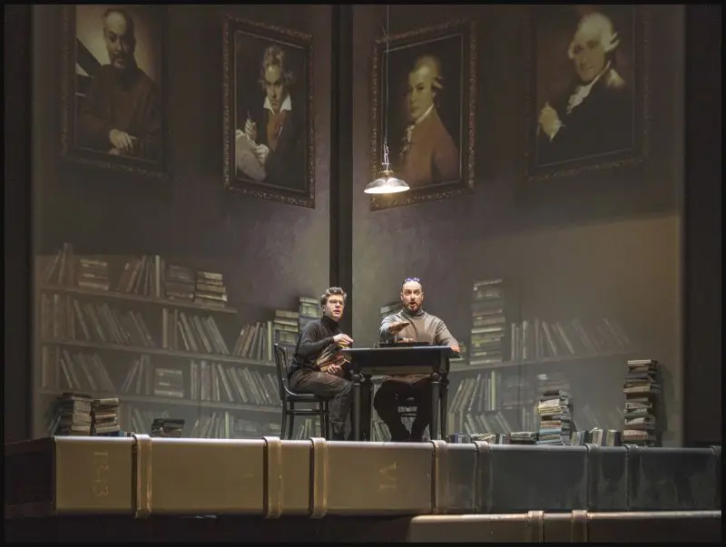 Nyman je u nás dobře znám, protože jeho hudba doprovázela Greenawayovy filmy i oscarové Piano Jane Campionové. Národní už uvedlo dvě jeho opery, debutového absurdního Muže, který si spletl svou ženu s kloboukem a Man and Boy: Dada. Letters, Riddles And Writs jsou jeho druhou operou, které měla premiéru v roce 1991. I Nyman a libretista Jeremy Newson se také zaměřili na Mozartův boj s nepochopením, ale nefabulovali. Čerpali z mimořádně otevřených a četných dopisů, které Mozart, jenž od dětství hodně cestoval, psal svým příbuzným. Ve vybraných psaních se ospravedlňuje před otcem, který sice stál u zrodu jeho kariéry, jenomže dospívající Mozart se jím už nechtěl nechat vodit, odejel do Vídně, a navíc se rozhodl se oženit. Ukazují ho jako člověka, který se nerad podřizoval konvencím, měl rád dvojsmyslné hádanky i fekální humor. Šetřit sice nedokázal, ale slušně vydělával. Zachytili Mozarta těsně před smrtí, když nemocný rekapituloval život, což je asi ta největší fabulace, jaké se dopustili, pominuli samozřejmě to, že si vybrali kontroverznější dopisy.