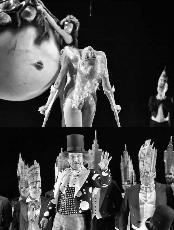 Protože se z Oranga zachovala jen předehra, doplnil je v druhé části satirický Antiformalistický jarmark, v němž si Šostakovič dělal legraci z boje komunistických kulturtrégrů v čele se Ždanovem proti nelidovému formalismu. Přestože socialistický realismus patří minulosti, dílo nevyčpělo, v každém režimu se objevují prázdné fráze, jimiž se utloukají odpůrci. Nadčasovost podtrhlo provedení, kdy se scéna změnila v palác, kde se koná schůze. V sedadlech sedí jen busty, v něž se změní i čtyři řečníci.