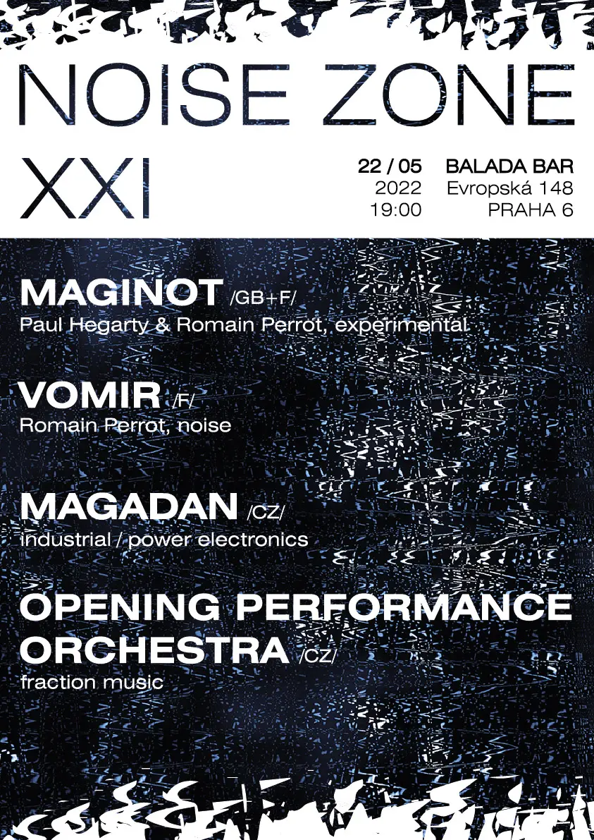 Noise Zone je otevřený projekt dlouhodobě mapující extrémní elektronickou scénu, jehož cílem je představení různých způsobů i výsledků práce se zvukovým materiálem. V neděli 22. května 2022 se v Balada baru uskuteční Noise Zone XXI, jíž se zúčastní francouzský noiser Romain Perrot (aka Vomir), Maginot (společný hudební projekt, za nímž stojí Paul Hegarty a Romain Perrot), industriální úderka … Continued