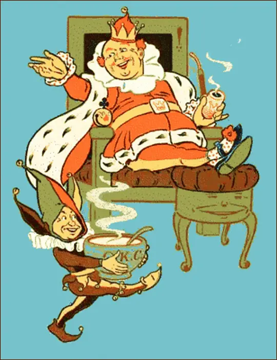 Byl jednou jeden veselý král, co kouřil fajfku, měl rád víno s ovocem (bowle) a zvuk houslí. Zřejmě nešlo o žádného konkrétního vladaře, i když v dějinách Walesu se vyskytuje jistý Coel Hen nebo také King Coel. Básnička začínající veršem „Old King Cole was a merry old soul“ inspirovala tisíc a jednu píseň, od skladby The Musical Box z alba