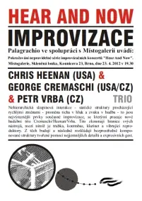 HCV_trioNehierarchická skupinová interakce – statické struktury procházející rychlými změnami – proměna ticha v hluk a zvuku v hudbu – to jsou nejvýraznější prvky současné improvizace, se kterými pracuje nové hudební trio Cremaschi/Heenan/Vrba. Trojice hudebníků zkoumá hranice svých nástrojů, mezi něž patří trubka, kontrabas, klarinet a vibrující reproduktory. Z jejich zvuků a tónů budují a následně rozkládají bezprostředně komponované struktury tvořené pomocí nejjemnějších detailů a expresivních gest.