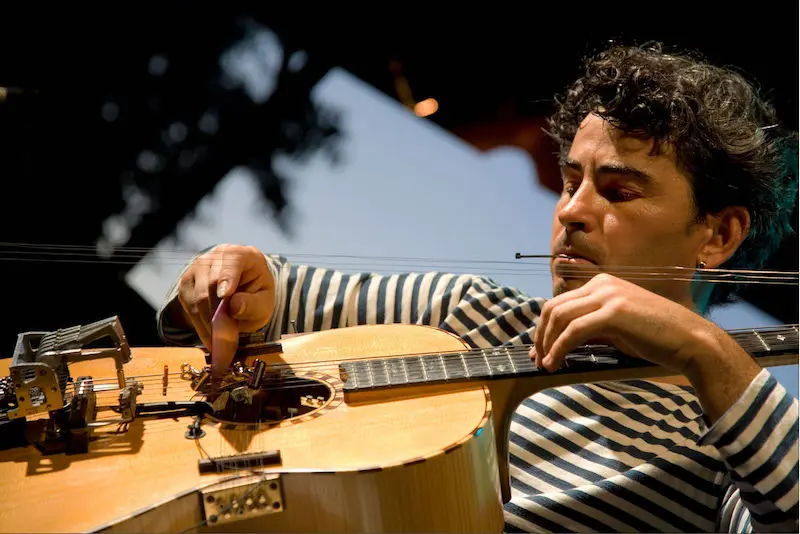 Angeli svůj nástroj označuje preparovaná kytara, což evokuje preparovaný klavír, vynález už nežijícího amerického experimentátora Johna Cage. Ale zatímco Cage mezi struny vkládal kovové či jiné předměty, aby z klavíru získal perkusivní tóny, Angeliho úpravy jdou mnohem dál a jeho tvorba je propojením tří rovin: hráčské, kompoziční i nástrojářské. Angeli mění nastavení v průběhu skladby pedály, střídá hru prsty a smyčcem, rejstřík zvuků se posouvá od kytary přes violoncello až po perkuse. Stavbu tohoto nástroje si u něj objednal dokonce Pat Metheny.