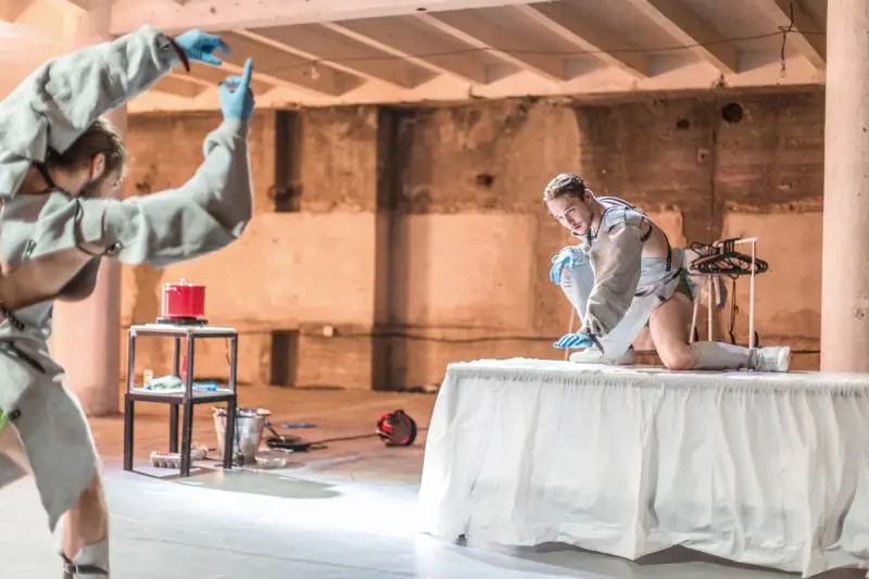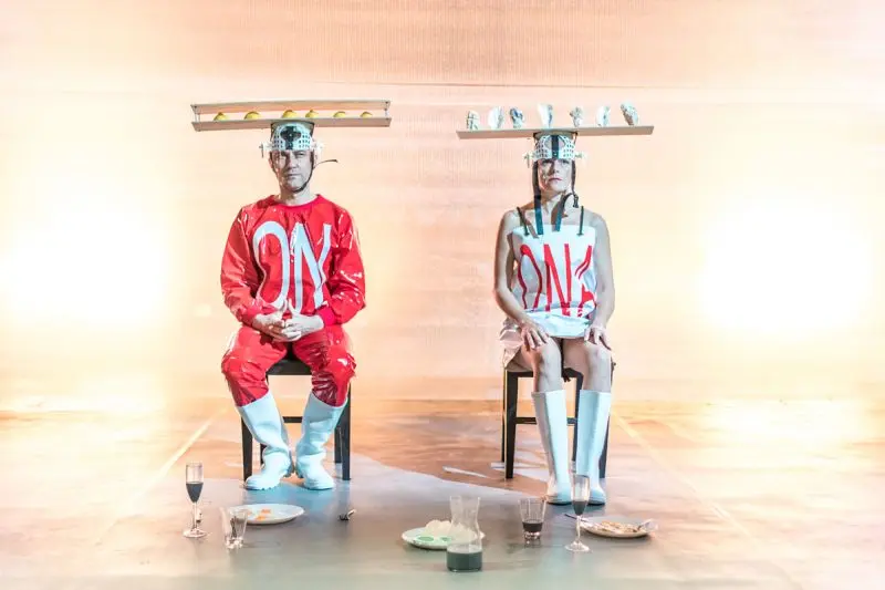 Produkce se pohostinsky realizuje v alternativním prostoru DUP 39, libreto obsahuje nejenom verše z Pustiny, ale také z dalších Eliotových opusů, vlastních textů autorky scénáře i starozákonní Knihy Kazatel. Existenciální krize, kterou Eliot do své proslulé kompozice vložil na počátku dvacátých let minulého století, není téměř sto roků po svém vzniku o nic méně aktuální, vnitřní vyprahlost i tápání společenských „reprezentantů“ pociťujeme též dnes. Strukturou dialogu mezi dvěma aktéry (Lucie Trmíková a Petr Jeništa) probleskuje naděje s akcentem na křesťanské hodnoty, i když nijak prvoplánově. Režisér vkládá skladbu hercům do úst jako dialog a můžeme být svědky jak partnerské roztržky, tak společného hledání nových cest, pakliže komplikovanou výpověď pro ilustraci poněkud zjednodušíme. Dramatické mezivztahové entrée připomíná i Eliotovo martyrium s duševně nemocnou manželkou, které také přibližuje nedávno na ČT Art reprízovaný film Tom a Viv režiséra Briana Gilberta z roku 1994. Velká poezie je doplňována celou řadou jevištních akcí, z nichž bychom některé mohli chápat jako hračičkaření, kdyby s textem podivuhodně nesouzněly. Oba protagonisté zprvu sedí za stolem v lesklých umělohmotných oděvech (jako z nějaké sci-fi), navržených Petrou Vlachynskou, jsou obsluhováni dvěma tanečníky Filipem Staňkem a Lukášem Nastišinem (později se ukáže, že skvělými), ti zprvu připraví pro Lucii i Petra každý po jednom volském oku – v inscenaci se totiž hodně vaří. Jsou oblečeni jako svářeči, hlavu chráněnou přes obličej, temeno i uši, jejich pracovní plášť však kryje trup jen zepředu, vzadu naopak odhaluje sporé lesklé slipy, v nichž zůstanou tanečníci i později po odložení ochranných prostředků. Jejich vypracovaná těla tak mohou v pohybových až artistických sekvencích doplňovat jevištní dění svou estetickou dokonalostí – ostatně jejich šéf a choreograf inscenace Václav Kuneš má průpravu v Holandsku pod vedením Jiřího Kyliána. U klavíru sedí komponista Martin Dohnal, autor dost podstatné složky produkce, doprovází velmi dobře zpívající aktéry, také však mimořádného kontratenoristu Jana Mikuška, který se v bizarních kostýmech (jednou i se světélkující obuví) objevuje na postranních ochozech-balkónech či vystoupá na stříbřitý žebřík, umístěný u zadní stěny čelem k publiku. Hudební stránka produkce se vyznačuje výrazovou barvitostí, od čísel lyrických až po zpěvánky s příměsí humoru (v nich Petr Jeništa zdatně paroduje operní machu). Roztomilostí, které poselství textu nijak nezpochybňují, ba právě naopak, by se dala vyjmenovat další řada: vaření barevných špaget a manipulace s nimi včetně jejich pojídání, dvoje obřadná převlékání herců, s nimiž pomáhají tanečníci, skotačící sklenice na stole, atletické evoluce členů 420 People, gurmánské srkání ústřic, v posledních minutách inscenace i zapálení téměř trampského ohníčku v plechovém vědru. Jan Nebeský má totiž mimořádný cit pro vytvoření na první pohled trochu absurdní jevištní reality, které ovšem brzy jako zcela samozřejmé podlehnete, čemuž pochopitelně napomáhá suverenita interpretů.