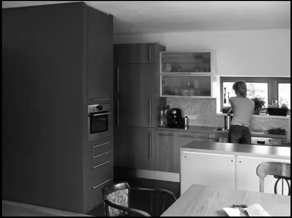 která se právě moc ,nenosí‘. Na rodinném domku od Šárky Dlouhé oceňuji v dobrém slova smyslu potlačení přirozených tvůrčích ambicí. Architektka pro svůj dům nehledala extravagantní vzezření (jak u mnoha architektů bývá pravidlem), ba ani nijak neexperimentovala. Svůj příbytek prostě odvodila od archetypu venkovského domu (podlouhlá, úzká stavba se sedlovou střechou). V konečném řešení tak stavba působí ve svém kontextu přirozeně. Středobodem, v zahradě (mezi vzrostlými třešněmi) volně stojícího domu je přirozeně obytný prostor s kuchyní, která zde na místo funkcionalistické kuchyně – laboratoře figuruje jako designovaný skvost vnitřního vybavení. Její ostře červené pravoúhlé objemy skvěle kontrastují s ostatním vybavením, zejména však s elegantními křivkami biedermayerských židlí a cetrisovými podhledy stropů schodiště. Součástí domku propojeného skrze velká dřevěná okna s okolní polabskou krajinou je vedle nezbytného vybavení a několika obytných místností, poskytujících svým obyvatelům dostatečný prostor, i autorčin ateliér.