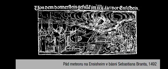 Ta totiž kromě působivých divů obsahuje i nenápadné odštěpky jednoho z nejpozoruhodnějších pozemských kamenů, tedy alespoň jednoho z nejpozoruhodnějších zaznamenaných neotesaných kamenů v dějinách civilizace. Spadlou hvězdu, která k údivu neznámého chlapce dopadla s ohlušující a spektakulární explozí 7. listopadu 1492 do polí poblíž alsaského Ensisheimu, asi padesát kilometrů na sever od Basileje. Tedy ani ne měsíc po Kolumbově objevu Ameriky, který se svými následovníky rovněž jako meteorit dopadl na utajený světadíl, ale to sem teď nepatří.