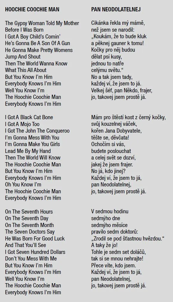 Ten výraz se nedá přeložit. Leckdo to zkoušel, ale všichni pohořeli. Velkej šéf, pan Někdo, frajer. Borec, samec, kápo, pasák. Žihadlo, pan Neodolatelnej. Jediný způsob, jak pochopit smysl esenciálního blues Hoochie Coochie Man, je povědět si, jak vzniklo, a pak se zanořit hluboko do historie, až ke kořenům americké taneční zábavy. Budete překvapeni, kam nás příběh tohoto slovního spojení zavede. Rozhodně však nečekejte bažiny v mississippské deltě. To už se spíš podíváme do běloskvoucího města Oz i s jeho čaroději a – především – čarodějkami. hoochie_coochie Fajnšmekrům netřeba vysvětlovat, že píseň Hoochie Coochie Man natočila pod hlavičkou vydavatelství Chess Records nejvýraznější postava moderního chicagského blues, původem mississippský kytarista a zpěvák McKinley Morganfield, známý pod pseudonymem Muddy (Mississippi) Waters. Nahrávka vznikla 7. ledna 1954 za asistence čerstvě založeného all-star bandu, díky němuž dnes patří produkce chicagské firmy bratrů Chessových právem do říše pohádek a bájí. Na kytaru hrál Jimmy Rogers, sám interpret velkého hitu That’s All Right, za piano se posadil Otis Spann, na harmoniku foukal Little Walter, do bicích řezal Fred Below a basu tvrdil Willie Dixon, který také skladbu vymyslel. Na druhé straně singlu, jenž se v žebříčku magazínu Billboard vyšplhal na osmou příčku, se marně hlásil o pozornost příjemný, leč zapomenutelný shuffle She’s So Pretty. Geniální riff, neobvyklá první sloka a sexy refrén dupáku Hoochie Coochie Man způsobily, že se k „béčku“ mnohý posluchač vůbec nedostal. hoochie_coochie2 Kontrabasista, příležitostný zpěvák a kytarista, ale hlavně autor William James „Willie“ Dixon pracoval pro producenta Leonarda Chesse od roku 1951 jako skladatel, talent scout a studiový hráč v jedné osobě. Svou vlastní hudební kariéru, na které pracoval od konce třicátých let, odsunul do pozadí a brzy proslul coby největší bluesový hitmaker, po jehož nápadech se dychtivě vrhali všichni jeho kolegové. Na seznam Dixonových úspěchů patří tituly Spoonful, Little Red Rooster, My Babe, I Just Want To Make Love With You, You Can’t Judge A Book By The Cover, Back Door Man, You Shook Me, The Same Thing, I’m Ready, I Can’t Quit You, Baby či I Ain’t Superstitious. Co píseň, to klasika. Roku 1955 se Willieho kolega ze stáje Chess Records Bo Diddley podepsal pod parádivý song I’m A Man, jenž je jasnou variací na skladbu Hoochie Coochie Man. Jelikož zde Dixon opět hraje na basu, nezdá se, že by v tom byl problém. Muddy Waters neváhal a odpověděl písničkou Manish Boy (někdy psáno Mannish Boy), která ještě lépe a efektněji využívá stop-time jako prostředek k vystupňování napětí. „I can make love to you, woman, in five minutes time!“ vykřikuje nadržený bluesman do kraválu svých kumpánů, a v tu chvíli se nenajde nikdo, kdo by mu nevěřil, že je „a natural born lovers man“. Hřmotný Willie Dixon nezapřel minulost profesionálního boxera (krátce dělal sparring partnera šampionovi v těžké váze Joeovi Louisovi). Zároveň měl duši básníka – na jeho textech je znát metoda, kterou si osvojil ve svých textařských začátcích, kdy nejprve napsal verše a teprve pak se staral, jestli půjdou zhudebnit. Když odezněla první vlna jeho sukcesu, zaměřil se na produkci představitelů nastupující bluesové generace Otise Rushe, Magic Sama a Buddyho Guye. Založil též Blues Heaven Foundation, organizaci spravující autorská práva bluesových muzikantů, „kteří byli v minulosti vykořisťováni“. V roce 1987 se mu podařilo nachytat na švestkách britskou rockovou skupinu Led Zeppelin: usvědčil ji, že si přivlastnila jeho melodii (v písničce Bring It On Home) a kus textu (v megahitu Whole Lotta Love). Podobně musel Bob Dylan ještě nedávno na desce Together Through Love přiznat, že se Dixonem nechal inspirovat při psaní písně My Wife’s Hometown. Tu už ale Willie neslyšel; zemřel na infarkt 29. ledna 1992 v kalifornském Burbanku a i do té Rokenrolové síně ho uvedli s křížkem po funuse. Kromě řady nesmrtelných šlágrů po něm zůstalo několik sólových alb a autobiografie I Am The Blues. ZAŽIVA UVAŘENÁ KOČKA Díky deskám a koncertům Muddyho Waterse se termín „hoochie coochie man“ rozšířil nejen mezi posluchači tradičního afroamerického blues, ale i ve fanouškovských základnách bílých kapel, které se vyrojily počátkem šedesátých let v Anglii a pro svůj razantní nástup se dočkaly označení „britská bluesová invaze“. Po Alexisu Kornerovi a Long Johnu Baldrym si skladbu osvojili Manfred Mann, Graham Bond Organisation, Rolling Stones i Bluesbreakers Johna Mayalla. Ti všichni si byli dobře vědomi jejího erotického náboje, sotvakdo však věděl, o čem přesně je tu řeč. Matoucím dojmem působily též verše „I got a black cat bone, I got a mojo too, I got the John The Conqueroo…“ („Mám pro štěstí kost z černý kočky, svůj kouzelnej váček, kořen Jana Dobyvatele…“) Kouzelný váček neboli „mojo“ představoval jakousi afroamerickou obdobu indiánského medicinového váčku či slovanské kaptorgy a patřil k základním atributům lidové magie zvané hoodoo (nezaměňovat s příbuzným náboženstvím voodoo). Dalším magickým předmětem, jenž mohl pomáhat i škodit a dokázal člověka učinit neviditelným, byla kůstka z těla černé kočky. Nebohé zvíře musela osoba praktikující hoodoo uvařit zaživa, a to nejlépe o půlnoci. Vzhledem k obtížnosti takového úkolu si prodejci těchto propriet (tzv. doktoři) pomáhali kostmi z kuřete, které natírali načerno. Mnohdy kost tvořila součást kouzelného váčku, provoněného levnými parfémy a oleji, jenž byl k dostání v 