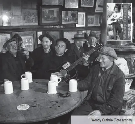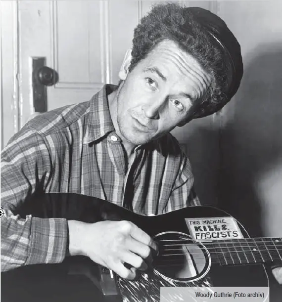 bsorbovat prvky Guthrieho osobnosti do svého vlastního projevu a vystupování, přičemž Kaufman dochází k objektivnímu zjištění, že samotní Zimmieho kritici i příznivci se nikdy nebyli v rámci svého vlastního tábora mezi sebou schopni dohodnout na tom, zdali byl tehdy Dylan „příliš guthrieovský“ anebo „příliš málo guthrieovský“. Nicméně, vlastní názor si uděláte nejlépe poslechem Dylanovy písně Song to Woody. V případě Woodyho Guthrieho zase velmi doporučuji jeho jesse-jamesovskou baladu o psanci jménem Pretty Boy Floyd, nahranou v březnu 1940 Alanem Lomaxem pro Kongresovou knihovnu ve Washingtonu. Závěrečná kapitola Kaufmanovy práce se zabývá odkazem Woodyho Guthrieho pro vysvětlení následných, šířeji pojatých historických a popkulturních trendů. Autor neopomine zmínit nevyhnutelnou „komodifi kaci“ původně politicky vyhraněného folku, kdy se na jeho popularitě začali přiživovat výrobci spotřebního zboží, od limonád až po auta. Jako „klenot“ v tomto ohledu autor zmiňuje někdejší novinový inzerát Americké mlékárenské asociace, v němž typická americká hospodyňka brnká na kytaru a v bublině u jejích úst je text: „Taky si přejete napsat protest song o stravovacích návycích své rodiny?“ Pokud jde o hudební odkaz Woodyho Guthrieho pro delší časový horizont do budoucnosti, Kaufman nabízí zajímavé úvahy, v nichž nechybí Billy Bragg a londýnský punk-bluesový band A3.